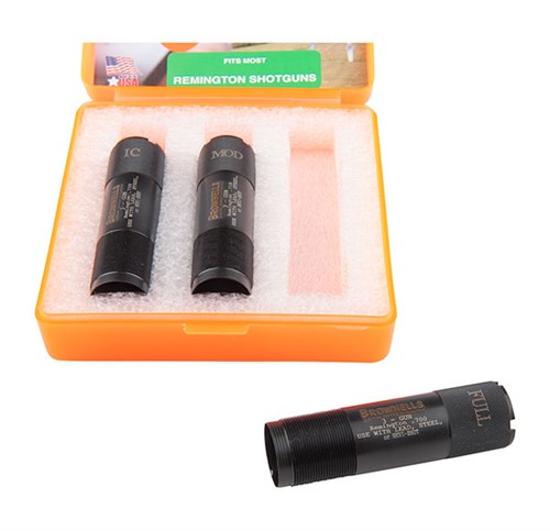 Los sets de tubos de choke están disponibles para escopetas Remington de 12 Gauge. Aunque no es probable que se usen en eventos de 3-Gun, se puede usar cartuchos de acero a través de estos tubos de choke con resultados excepcionales. No dispares cartuchos de acero más grandes que BB ni ninguna carga de acero más rápida de 1550 FPS a través de las constricciones Full o Extra Full.