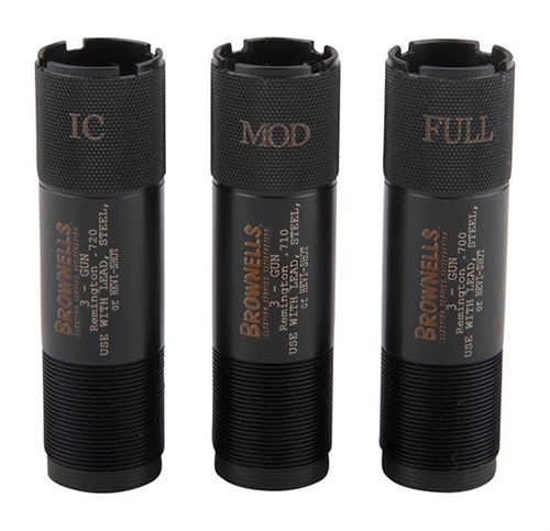 Brownells & Carlson’s 3-Gun Extended Choke Tubes are designed specifically for use in 3-Gun competitions. This 3-piece choke tube set allows the shooter to select the exact choke tube needed for any stage. Included choke tubes are Full, Improved Cylinder & Modified, ensuring you can quickly take out clay pigeons or knock down that long distance steel target. The three tubes are manufactured from 1704 stainless steel and designed to throw tighter and denser patterns than conventional choke tubes. Each choke tube is knurled on the end to allow for quick and easy removal. Constriction and size are laser marked on the end and body for easy reference. Slugs, sabots, and rifled slugs are not to be used in any choke constriction tighter than Improved Cylinder. Remember to pattern your shotgun choke tube with the specific shot shell load you are going to be using. Different brands of ammunition throw different patterns from the same choke tube. This choke is backed by Brownells & Carlson's lifetime warranty. Choke Tube Sets available for Remington 12 Gauge shotguns. Though not likely to be used at 3-Gun events, steel shot may be used through these choke tubes with exceptional results. Do not shoot steel shot larger than BB or any steel load faster than 1550 FPS through the Full or Extra Full Constrictions.
