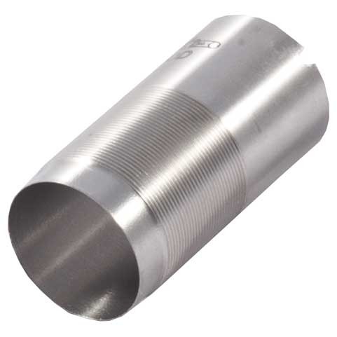 SPECS: Approximately 1-1/2" (3.8cm) long. Stainless steel. Threads are as follows - Tru-Choke-style Tru-Tube 10 gauge are .865"-44, 12 gauge are .795"-44, 16 gauge are .718"-44, 20 gauge are .675"-44, 28 gauge are .613"-44 tpi, .410 are .478"-44 tpi.