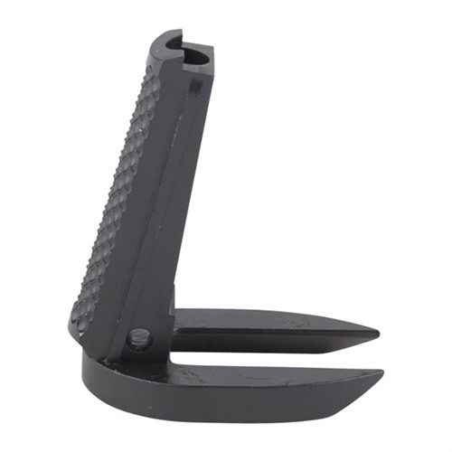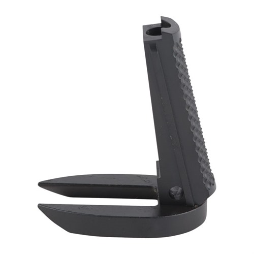 La carcasa plana incrementa el área de superficie de agarre, ayudando a mantener la pistola en su lugar durante disparos rápidos. Está disponible en acero azul o acero inoxidable con un grabado de 25 lpi que ayuda a mantener la pistola centrada en tu agarre.