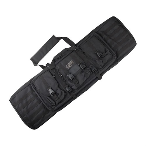 Heavy-duty padded case holds two rifles, two pistols, and extra gear. Main compartment has thick foam on all six sides with plenty of room for rifles up to 41" in length. Adjustable straps inside keep your rifles securely in place, while corner pockets protect the muzzle and buttstock. A cushioned internal divider prevents the rifles from rubbing together. Inside the big external compartment you’ll find two padded pockets for pistols, optics, or more small stuff. Three more exterior pouches will hold boxes of ammo, a cleaning kit, or spare magazines. External MOLLE loops allow you to attach additional gear. Carry by the padded handle, detachable shoulder strap, or the back pack-style shoulder harness.