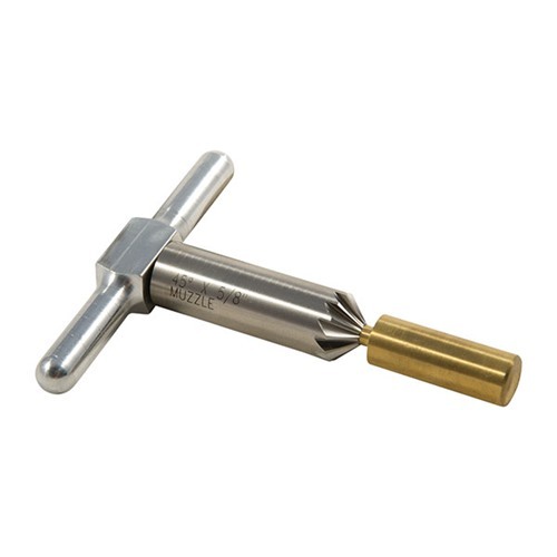El cortador de chaflán de 45° es ideal para romper los bordes de la estría en los cañones de rifles y pistolas, asegurando una salida limpia de los proyectiles. Además, chafla las bocas de las cámaras del cilindro de los revólveres para facilitar recargas rápidas.