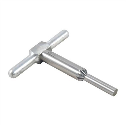 El cortador de chaflán de 45° rompe los bordes de la estría para una salida limpia de la bala o chaflana las bocas de los cilindros de revólver para recargas rápidas. Este conjunto incluye el cortador, un mango y un piloto, todo en una caja de polipropileno.