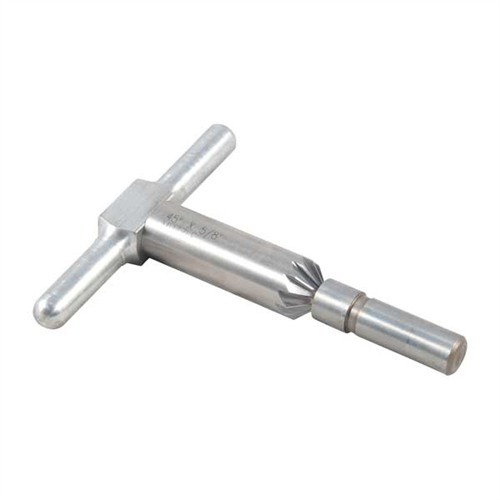 El cortador de chaflán de 45° es ideal para romper los bordes de las estrías y asegurar una salida limpia de la bala, o para chaflanar las bocas de los cilindros de los revólveres, facilitando recargas rápidas. Este conjunto incluye el cortador, un mango y un piloto, todo en una caja de polipropileno.