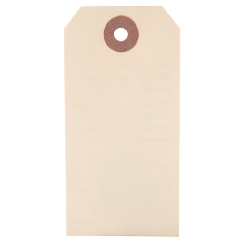 Tamaño: 3-3/4" (9.5 cm) x 1-7/8" (4.8 cm). Agujero reforzado de 1/4" (6.3 mm) para el lazo de la etiqueta. Hechas de cartón pesado. Disponibles en manila, azul claro y amarillo.