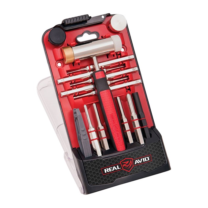 ACCU-PUNCH® HAMMER & ROLL PIN PUNCH SET The Real Avid Accu-Punch® Hammer & Roll Pin Punch Set is a comprehensive toolkit designed to facilitate the safe and efficient removal and installation of roll pins in firearms. This set combines ergonomic design with high-quality materials to ensure precision and control during gunsmithing tasks. Description and Features: Ergonomic Hammer: The set includes a perfectly balanced hammer with a rubberized, ergonomic grip, providing comfortable handling and precise control. The hammer comes with four interchangeable heads—rubber, brass, steel, and nylon—allowing Customers to select the appropriate material for specific tasks, minimizing the risk of marring or damaging firearm components. Comprehensive Punch Selection: The kit offers a range of roll pin punches essential for firearm maintenance: Roll Pin Punches: 1/16", 5/64", 3/32", 1/8", 9/64", 5/32", 3/16", 7/32", 1/4" Pin Alignment Tool: A proprietary pin alignment tool simplifies the process of starting tiny pins, ensuring accurate and frustration-free installation. Organized Storage: All components are housed in a modern, stand-up case that keeps tools organized and easily accessible. Specifications: Hammer: Ergonomic design with four interchangeable heads (rubber, brass, steel, nylon). Roll Pin Punches: 1/16", 5/64", 3/32", 1/8", 9/64", 5/32", 3/16", 7/32", 1/4". Additional Tool: Pin alignment tool for precise pin installation. Case: Stand-up design for organized storage. Customer Insights: Our customers report that the Real Avid Accu-Punch® Hammer & Roll Pin Punch Set is an invaluable addition to their gunsmithing toolkit. The ergonomic hammer and variety of punch sizes cater to a wide range of tasks, while the pin alignment tool simplifies the installation of small pins. Customers appreciate the organized stand-up case, which keeps tools readily accessible and neatly stored. Incorporating the Real Avid Accu-Punch® Hammer & Roll Pin Punch Set into your gunsmithing toolkit ensures you have the specialized tools necessary for efficient and precise firearm assembly and maintenance.