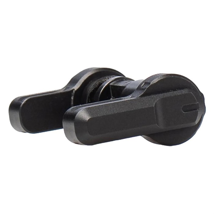 Introducing the PRO Series Ambidextrous Safety Selector. Forged with Premium Materials and Engineered for a Safe, Reliable, and Precise Shooting experience. This drop-in part is configurable with a reversible selector drum, allowing for either a 45 or 90-degree throw out of the box. Each lever is retained by captured detents, which eliminate the possibility of loosening lever fasteners even during the most demanding firing schedules. Two different lever lengths allow shooters to maintain the benefits of an ambidextrous selector without creating interference for their dominant firing hand during manipulation. This safety selector is compatible with most AR15 and AR10 platform rifles. INCLUDES: Safety Drum - Finish: Black Nitride Safety Lever - Finish: Anodized Black