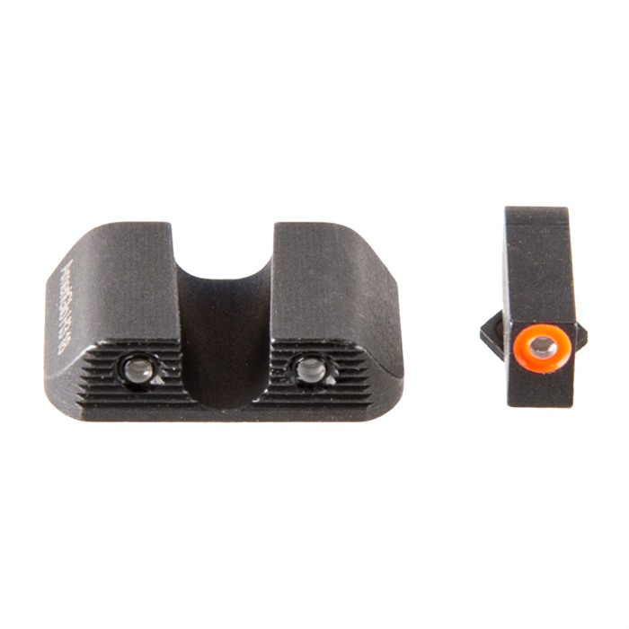 The standard-issue night sight set for the FBI and US Marshals! AmeriGlo’s Agent night sight set for Glock® is a major step forward in night sight design that delivers improved visibility and faster sight acquisition in any lighting conditions. These are low-profile, fixed sights designed to meet the daily carry needs of law enforcement officers. AmeriGlo Agent sights for Glock® employ the proven 3-dot configuration preferred by many experienced shooters. The ProGlo style front blade has a vivid green Tritium lamp surrounded by a bright orange outline, so there’s no trouble identifying your front sight under stress. The fixed rear sight has a rounded U-notch flanked by two green Tritium lamps with subdued black outlines. Drop-in replacements for factory sights Swiss-made self-illuminating Tritium lamps are backed by a 12-year warranty Rear U-notch (all): .165" wide Front sights: .140" wide (G42,43 is .125" Wide) Glock® 9mm/.40 S&W/.357 SIG front: .180" high Glock® 10mm/.45 ACP front: .165" high Glock® 42/43 front: .190" high Gen5 sights fit all models of Glock Gen5 pistols ONLY (front: .200" high) AmeriGlo Agent night sights are machined from high-grade steel barstock, dehorned to prevent snagging on your clothing during the draw, and given a durable, non-reflective black finish to match your Glock’s slide. Even so, the rear sight body is shaped to support one-handed slide racking in an emergency.