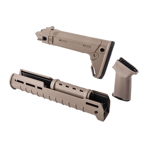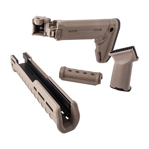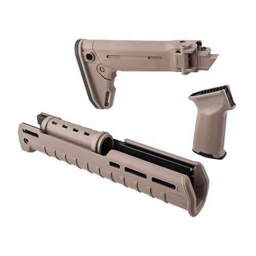 Update your Kalashnikov with these Magpul kits that feature the AK-47/74 Zhukov stock and handguard along with the Magpul MOE AK+ grip. The Magpul Zhukov-S Stock is a no-compromise folding stock for the modern AK. The Zhukov-S Stock casts aside traditional AK stock shortcomings and offers a folding, collapsible stock with QD sling mounts, modular Cheek Risers (sold separately), and a shock-absorbing rubber butt-pad for superior traction. The Zhukov has right-side folding for compatibility with side-mounted optics. Designed to fit most common stamped AK receivers without modification via a unique wedge block, the durable injection molded polymer Zhukov-S Stock redefines the human interface with the AK platform. The Magpul Zhukov Hand Guard is a fully-featured AK forearm for the modern AK. The Zhukov Hand Guard casts aside traditional AK forearm shortcomings and offers an extended option for modern shooting techniques, an aluminum chassis for strength and heat dispersion, a comfortable injection molded exterior for superior ergonomics, and M-LOK slots for optimized accessory attachment. Compatible with the Ultimak gas tube rail for optics mounting, the Zhukov Hand Guard redefines functionality for the modern AK platform. Installation requires removal of the hand guard retainer. A drop-in upgrade for AK-pattern pistol grips, the MOE AK+ is compatible with reinforced and unreinforced receivers. Designed to improve ergonomics and weapon control, the MOE borrows the rubber-overmolded surface of the popular MOE+ AR-15/M4 grip to ensure a positive and comfortable hold on the weapon. It is compatible with Magpul Grip Cores for storage customization. Please note that the Plum kit includes a black version of the MOE AK+ grip.