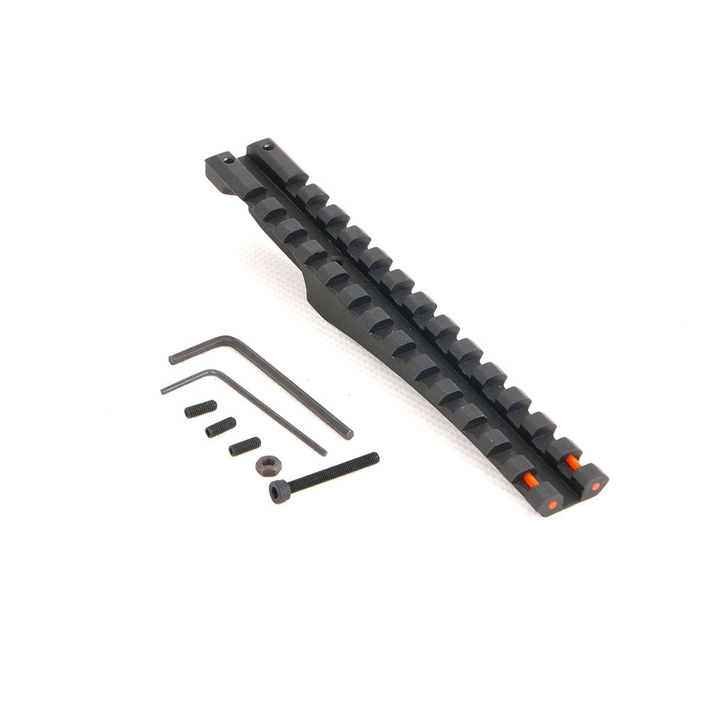 The German Tactical Systems AK Extended Picatinny Sight Mount with Fiber, the ultimate accessory to enhance your AK rifle. This innovative product replaces your AK sight with a Picatinny rail, allowing you to mount low-profile optics for improved aiming precision.