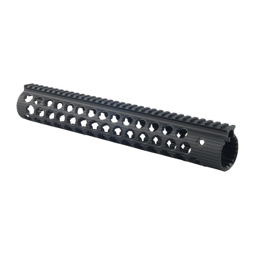 El handguard de flotación libre, fabricado en aluminio mecanizado, utiliza un exclusivo sistema de tuerca de cañón y bloqueo rotativo para asegurar una alineación adecuada entre el riel superior y el riel del receptor. El handguard se desliza sobre el cañón y el tubo de gas en un ángulo offset, hasta que la tuerca de cañón con muescas se indexa en el canal ranurado interno para un ajuste seguro.