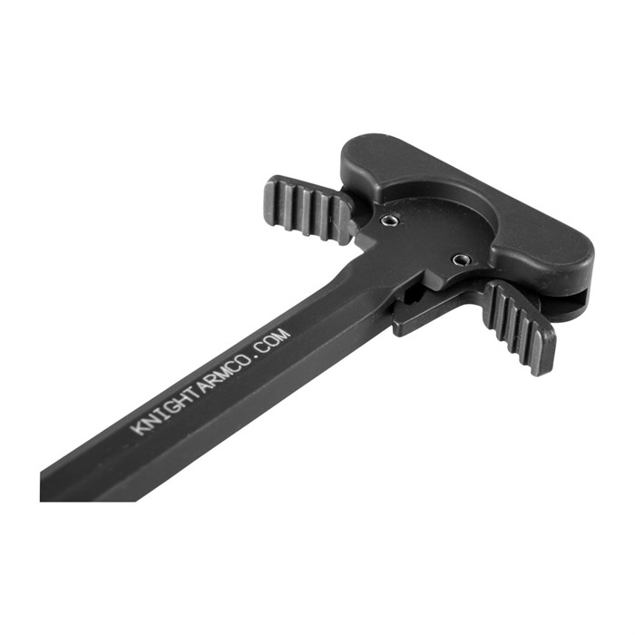 The KAC 5.56mm Ambidextrous Charging Handle is another step forward in the effort to deliver the most ergonomic firearm accessories to the end user. Intermediate sized latch pads are easily accessible and permit manipulation of the charging handle with a pinch-grip, index finger hook, or knifehand from either side of the receiver, without over-protrusion posing a snag hazard. Innovative design will not cause the handle to lock-up even if one of the latches is damaged. Aluminum construction.