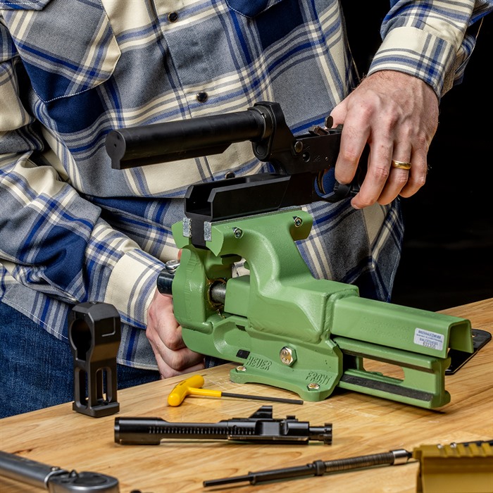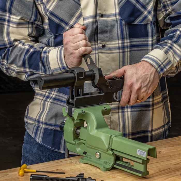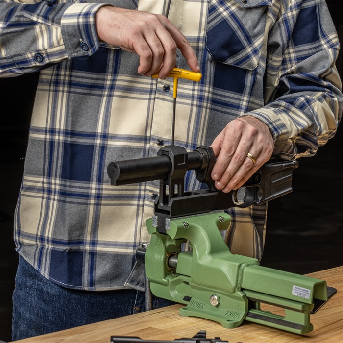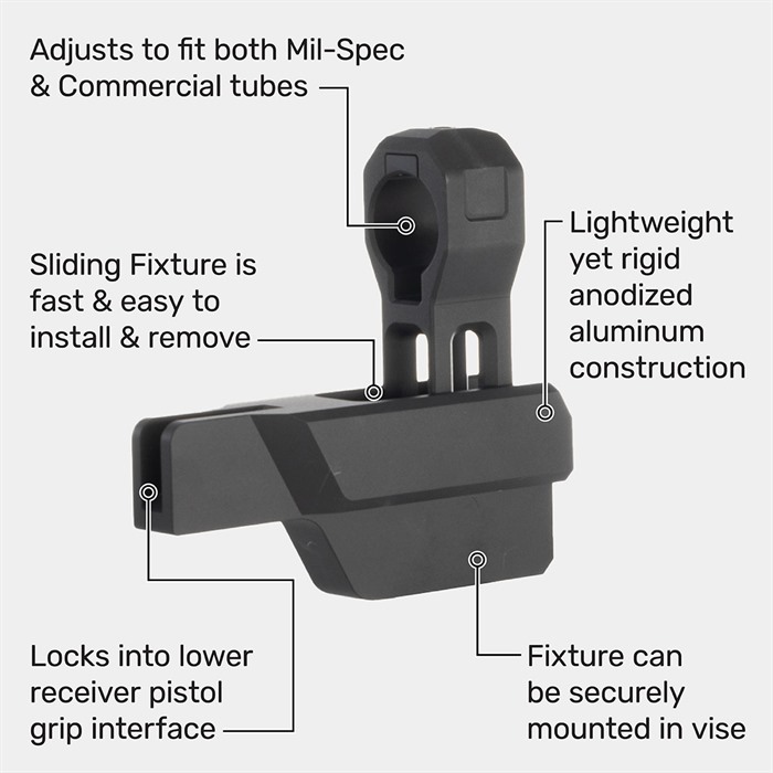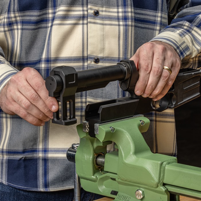Por eso hemos desarrollado el AR-15 Lower Receiver Extension Vise Fixture. Fabricado en aluminio anodizado, coloca el accesorio en tu prensa favorita, como la Brownells Bench Vise, y apriétalo. Inserta el receptor inferior en el accesorio con el tubo de buffer a través del soporte deslizante. Mueve el soporte deslizante hacia el receptor, dejando suficiente espacio para una llave de armero. Ajusta el soporte para tubos mil-spec y comerciales simplemente usando un tornillo de ajuste en la parte superior del soporte deslizante.