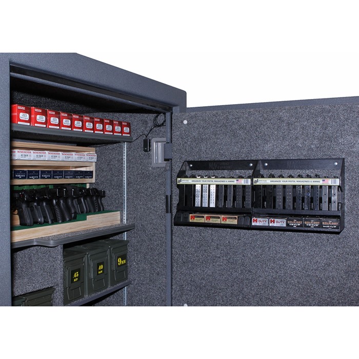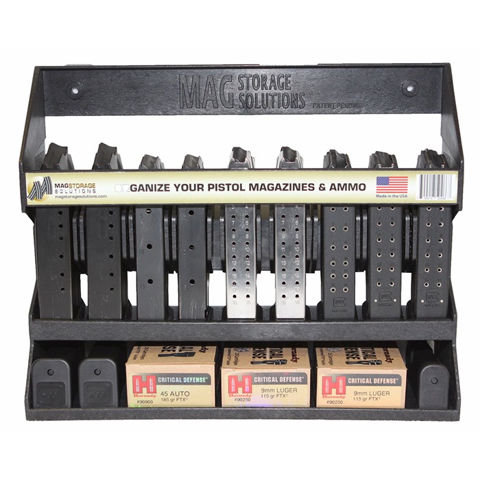 Handy storage rack easily mounts to wall or inside of gun safe door to store organize six 30-round AR-15 mags, while maintaining ready access to them. Helps you get rid of the clutter of mags in drawers, at the bottom of your safe, and other locations where they can get dirty or suffer feed lip damage. Magazines securely snap in/out of the Magholder, which keeps them from bumping into each other and causing accidental damage. Works for both metal GI-style mags or polymers like the Magpul® PMAG®. Optional Neodymium Magnet Kit attaches to the Magholder and lets you mount it directly to a steel safe door, inside of a metal locker - any steel object where drilling holes for screws would be difficult or impossible. Pak of 4 - these rare earth magnets really grab on and won't let go! PISTOLMAGHOLDER: Securely Store and Organize Pistol Magazines and Ammo Consumer Adjustable Dividers with 60 adjustment slots Will accommodate loaded/unloaded mags, polymer or steel, single or double-stack Ideal for most standard pistol magazines .22 thru .45 cal. Magazine round count indicator windows are commonly visible