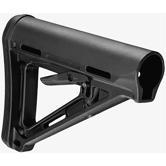 Magpul Original Equipment (MOE) carbine buttstock provides the quality, durability, and ergonomic benefits of Magpul’s CTR stock in a rugged, economical, drop-in package. Strong, A-frame design is lightweight and comfortable, yet provides operator with plenty of support. Comb contour is wider than standard issue M4 stock to help shooter maintain a solid, consistent cheekweld. Streamlined exterior and protected release lever won’t snag on clothing, gear, vehicle interior, or vegetation. Heavy duty, spring-loaded release lever allows fast length-of-pull adjustments and won’t dig into your hand. Impact- and heat-resistant, polymer construction includes molded-in reinforcements at stress points, plus two slots for web slings and a hole for a toe-mounted sling swivel or clip-on sling. Soft, synthetic rubber buttpad increases comfort and helps prevent slippage. Mil-Spec fits 1.14" O.D. buffer tubes on Colt-manufactured M4 and similar mil-spec tubes that accept both four- and six-position collapsible stocks.