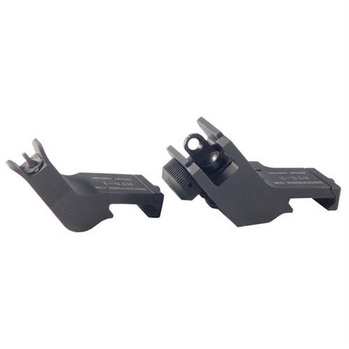 Las miras de respaldo de aluminio mecanizado se montan en un ángulo de 45° para permitir una transición instantánea simplemente inclinando el rifle. La mira trasera se monta en el riel del receptor, mientras que la mira delantera se coloca en la parte superior del riel del guardamanos. Se montan en el lado derecho del receptor para tiradores diestros, eliminando la necesidad de co-testear las miras de respaldo a través de tu óptica.