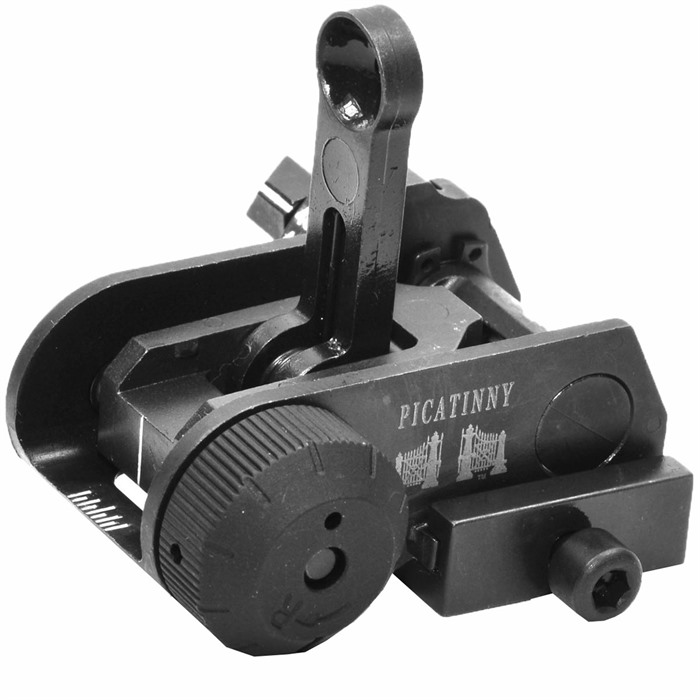 Current U.S. Army standard-issue backup rear sight for M4 carbines and M16A4 rifles flips up instantly at the touch of your thumb when primary sight fails or tactical situation makes iron sights preferable. Designed in conjunction with Picatinny Arsenal engineering staff and rigorously tested at Fort Benning and Aberdeen Proving Ground for robustness, ease of use, and effective targeting out to 600 meters. Detent-locking lever lets you quickly switch to one of eight range settings: 200, 300, 350, 400, 450, 500, 550, and 600 meters. Adjust windage easily with grooved, A2-style windage knob and position markers on the back of the sight for repeatability of settings. Bright, white, laser etched numbers and markers are clearly visible even in low light. Rugged machined steel construction ensures sight retains zero even under heavy, full-auto fire. Clamps securely to the rearmost slot of MIL-STD 1913 Picatinny or Weaver-style accessory rail on flattop receiver via simple but strong locking bar and bolt. Rounded corners and beveled edges further reduce danger of snagging on other gear when sight post is down. Regulates correctly with A2 front sight on any AR-15-style rifle or carbine; instructions included for adjusting front sight post height to set exact zero. Designed to co-witness with most non-magnifying optical sights.