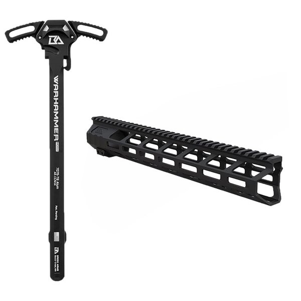 The Breek Arms WARHAMMER MOD2 ambi charging handle is a simple and affordable upgrade that will substantially increase the use of your AR-15. Easily grab on either side of the handle and you can quickly charge your rifle even with large gloves with the textured grooves that are cut into the latch handles. The wide set-back latches work great for large optics. The low profile design keeps it slim and sleek looking without sacrificing functionality. Made entirely out of 7075 aluminum for added strength and durability! The new MOD2 design features improvements for further reducing gas blowback in the shooter's face. The relief cuts on the top and bottom of the stem are designed to help direct extra gas out the side and away from your face. And for any gas that does manage to go straight back, we increased the height of the shelf to better cover the back of the upper. These modifications help improve the shooting experience, especially when shooting suppressed!