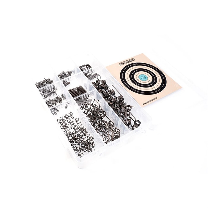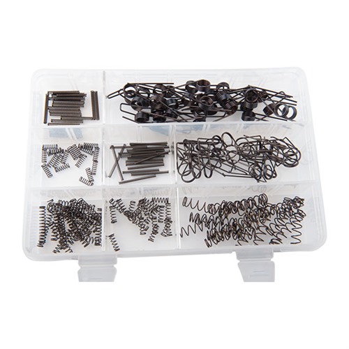 La caja de herramientas incluye 20 de cada uno de los resortes utilizados en el receptor inferior del AR-15: resorte del retenedor del percutor, resorte del gatillo, resorte del martillo, resorte del desconector, resorte de la palanca del cargador, resorte del selector y resorte de detención. Ideal para armeros de departamento, tiendas de armas al por menor o cualquier persona que trabaje, construya o repare grandes cantidades de AR-15.
