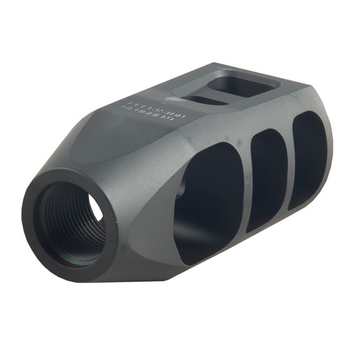 Designed for tactical applications that require minimal dust signature. A massive symmetrical blast baffle, combined with two compensated front baffles, redirect gas to the sides and upward delivering unparalleled recoil reduction while also minimizing muzzle rise and ground disturbance. High tolerance class-3 threads machined in same operation as bore aperture ensures perfect concentricity; this combined with a progressively decreasing baffle thickness minimizes bullet flight disturbance resulting in less yaw, higher BC, and improved accuracy. Computer FEA optimized for maximum strength to weight ratio and impact survivability. Precision CNC machined from high strength HTSR 400-series stainless steel bar for superior heat and corrosion resistance. Available in either an ultra wear resistant DLC (Diamond-Like Carbon) matte black finish, or stainless steel in-the-white, satin finish. Wrench flats on top and bottom for easy installation and removal. Accu-Washer Muzzle Alignment System advised for installation.