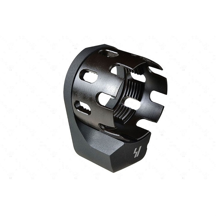 El end plate extendido cuenta con un soporte para un Quick Detach sling swivel mount, que se ha desplazado hacia atrás, alejándose de la webbing de la mano principal. Esto permite manipulaciones del arma en espacios reducidos y bajo estrés, sin el dolor sorprendente que puede resultar de una mano atrapada al usar un sling conectado a un end plate QD plano estándar.
