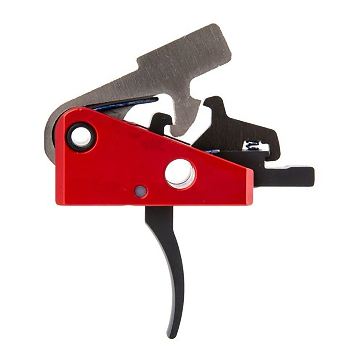 El peso de tiro está calibrado de fábrica para un primer stage de 2 libras y un segundo stage de 2 libras. La carcasa del gatillo está construida con aleación de grado militar 6061 T6, mecanizada CNC utilizando robótica de última generación y anodizada para una durabilidad superior. El martillo está cortado por wire EDM de acero S7, combinando dureza para resistir el desgaste con una resistencia al impacto superior para soportar un uso intensivo sin astillarse o romperse, y está recubierto de teflón-níquel para lubricidad.