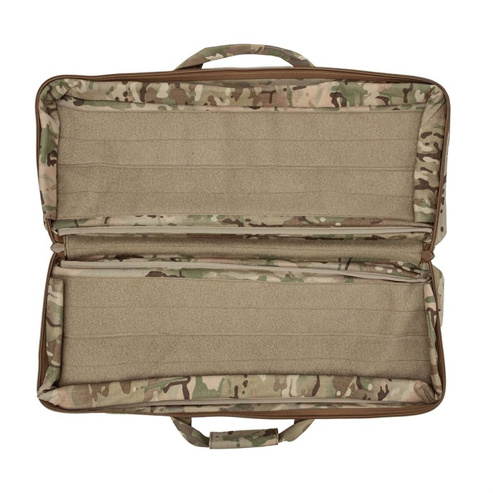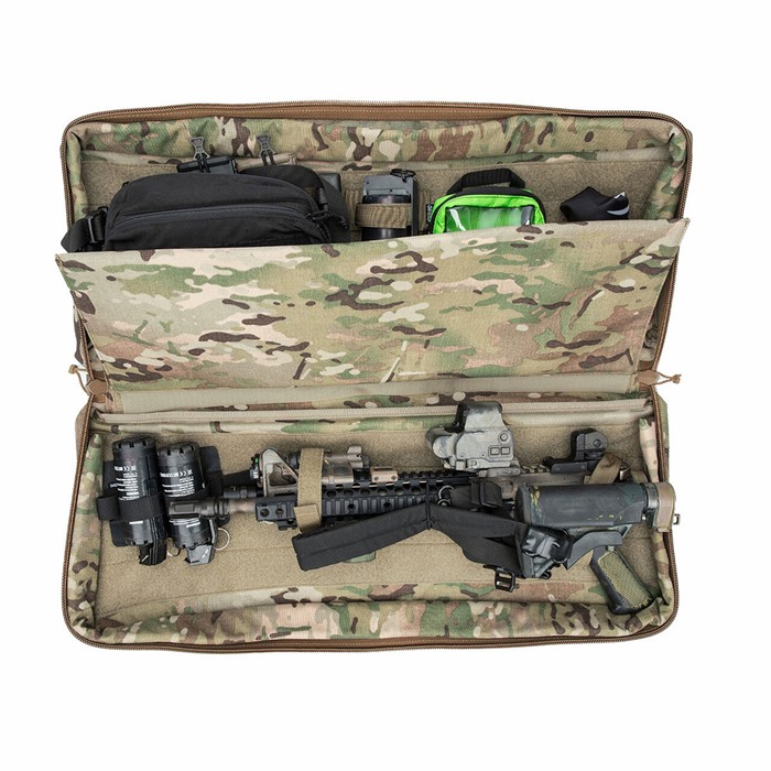El interior de la bolsa está cubierto con velcro loop. Este material añade una capa extra de protección a tu equipo, no raya los acabados metálicos y proporciona opciones de configuración ilimitadas para los anclajes de correa modulares incluidos. Estos anclajes se pueden orientar horizontal o verticalmente para ayudar a asegurar armas, granadas o bolsos de varios tamaños.
