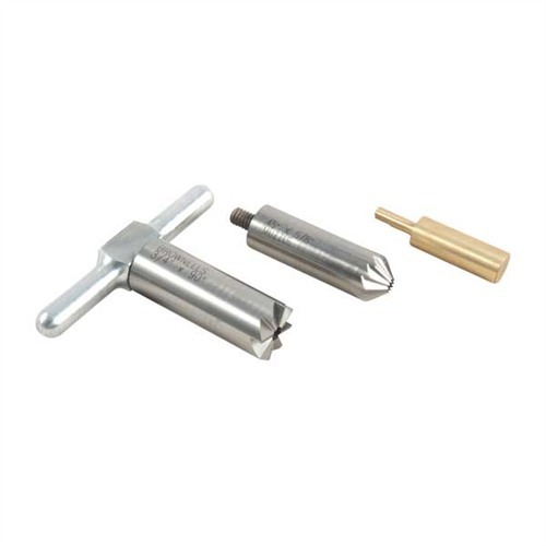 050806012790 El conjunto incluye: un cortador de cara de 90° para cuadrar un cañón después de acortarlo o reparar daños; un cortador de chanfreinado de 45° para romper los bordes de la estría para una salida limpia de la bala o chanfreinar la boca de un cilindro de revólver para recargas rápidas; además de un mango que se adapta a cualquiera de los cortadores y un piloto de latón. El piloto intercambiable mantiene el cortador correctamente alineado. Compra pilotos adicionales para usar un cortador en muchos calibres diferentes. Pilotos para otros calibres disponibles por separado.Pedido pendiente, tiempo de entrega aproximado 4-12 semanas desde el almacén de EE. UU.
