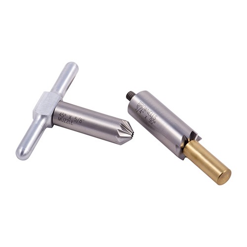 050806012813 El conjunto incluye: un cortador de cara de 90° para cuadrar un cañón después de acortarlo o reparar daños; un cortador de chanfreinado de 45° para romper los bordes de la estría para una salida limpia de la bala o chanfreinar la boca de un cilindro de revólver para recargas rápidas; además de un mango que se adapta a cualquiera de los cortadores y un piloto de latón. El piloto intercambiable mantiene el cortador correctamente alineado. Compra pilotos adicionales para usar un cortador en muchos calibres diferentes. Pilotos para otros calibres disponibles por separado.Pedido pendiente, tiempo de entrega aproximado 4-12 semanas desde el almacén de EE. UU.