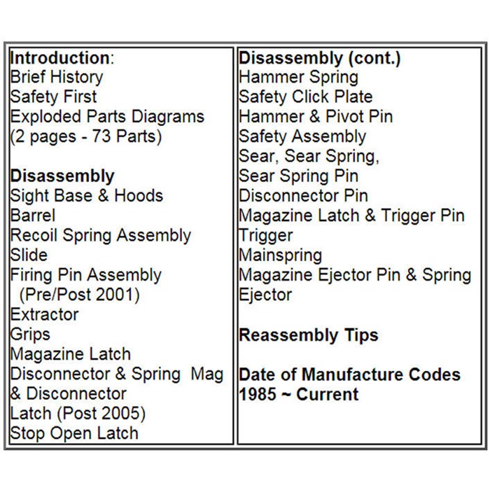 Llena de desgloses detallados de piezas e instrucciones de procedimiento simples e intuitivas, la Guía de Montaje y Desmontaje de Browning Buckmark es la adición perfecta a cualquier kit de propietario. Los lectores también encontrarán algunos trucos de la industria que ayudarán con el funcionamiento adecuado.