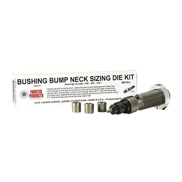Gracias a los kits de Bushing Bump Neck Die de Forster, los recargadores de precisión pueden controlar finamente la cantidad de tensión aplicada a los cuellos de sus cartuchos. Cada uno de estos kits de matrices de tamaño incluye una matriz de tamaño pulida a mano que coincide perfectamente con el calibre de tu arma de fuego, así como tres tamaños de bushing seleccionados a mano por el personal de Forster.