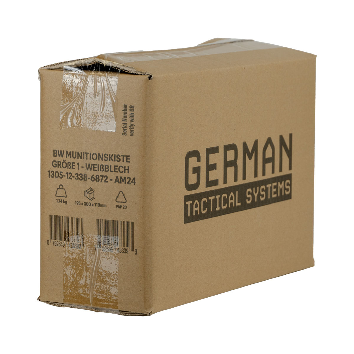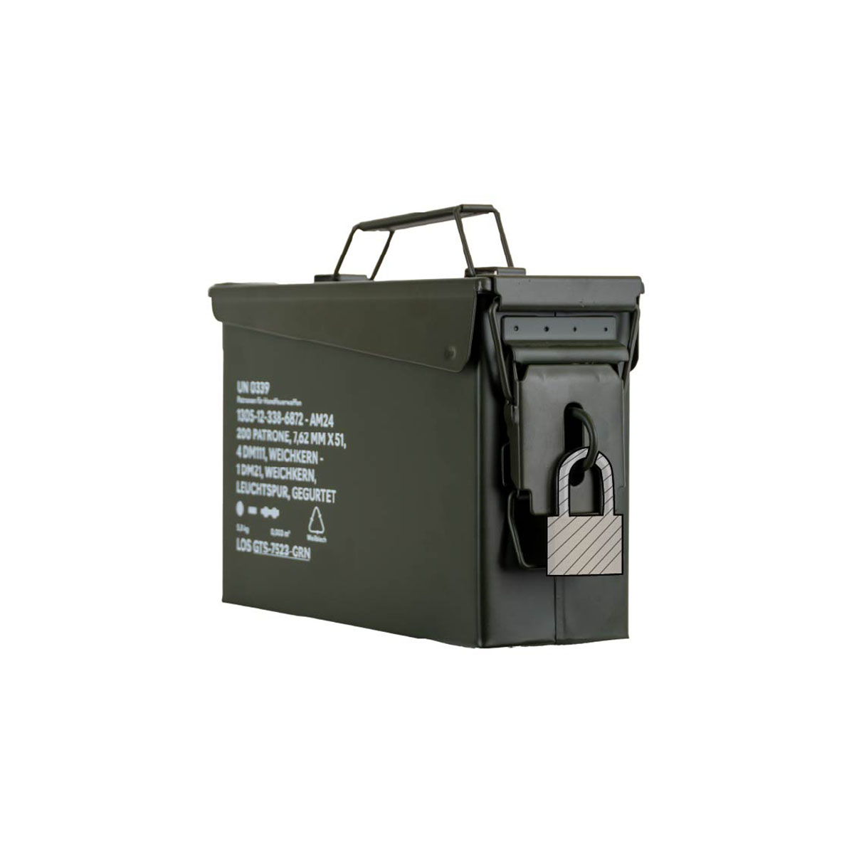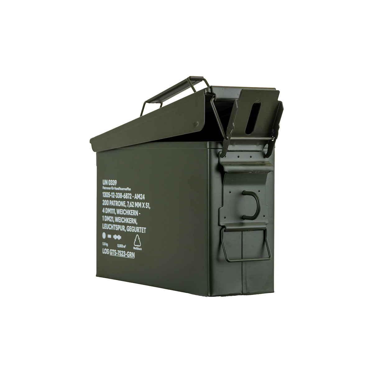 0792649433393 The German Tactical Systems BW Ammo Can (NATO Size 1 – 7.62 mm / .30 Cal) is built from rugged tinplate steel, providing dependable protection against dust, moisture, and impacts. Designed for demanding use in the field, during transport, or in storage, it keeps your ammunition and gear secure in any environment. A continuous rubber gasket ensures a tight seal, while the heavy-duty lever-lock latch keeps the lid firmly closed. For extra security, the integrated padlock tab allows you to lock the contents. The foldable steel carry handle makes transport comfortable, even with gloves, and the stackable design is ideal for organized storage and logistics. Key Features: NATO Size 1 (7.62 mm / .30 Cal) – new production from robust tinplate steel Strong lever-lock latch for secure closure Continuous rubber gasket for dust and moisture protection Foldable steel handle for safe, comfortable carrying Integrated padlock tab for added security (lock not included) Stackable design – ideal for storage and transport Color: NATO Green Perfect for storing ammunition, tools, or mission-critical equipment, the GTS BW Ammo Can delivers military-grade reliability for professionals and enthusiasts alike. Pair it with the GTS Gear Dehumidifier to keep contents dry and corrosion-free for long-term storage.Plazo de entrega de aproximadamente 6-10 días.