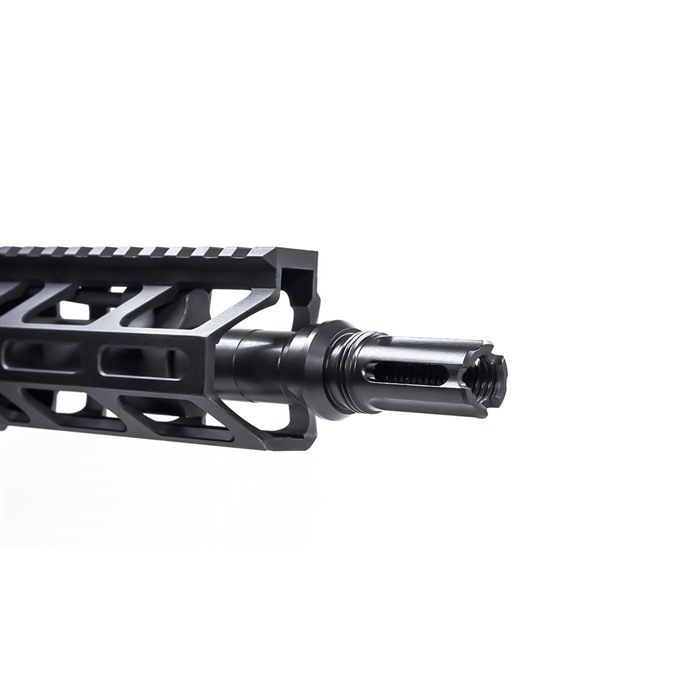 Breek Arms’ lineup of Outside Threaded Muzzle Devices is an affordable upgrade that gives you the option to run a flash hider or muzzle brake while utilizing the Breek Arms Castle Blast Shield as a forward blast diverter or concussion device. Simply slide the blast shield over the outside of the muzzle device and turn the blast shield on. This gives the shooter a more pleasant experience when firing especially for shorter platforms that tend to have an overbearing concussion. This caged style flash hider has added retention on the tines to ensure durability. FEATURES: Rated for 10.5" barrels and up. Internal Threads Disrupt Gas Expansion Resulting in Less Flash Design: 3FO-C: 3 Prong Caged Outside Threaded Flash Hider Outside Thread: 13/16 x 16 TPI Material: 4140 Prehard Steel Nitrided Cone Shape Lockup Provides a Tighter & More Concentric Fit Comes with 1 Crush Washer Overall length: 1.58 Inches Weight: 2.2 oz (223) 1.9 oz (9mm) Designed & Manufactured in America Caliber & Thread Options: Cal: 223/556; Thread: 1/2x28 Cal: .30; Thread: 5/8x24 (coming soon) Cal: 9mm; Thread: 1/2x28 Cal: 9mm; Thread: 1/2x36