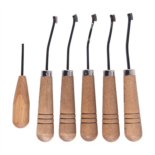 818262100440 Realiza cualquier trabajo de checkering, desde el diseño hasta el acabado, patrones simples a complejos, en todas las maderas. Seis herramientas completas; Mangos Offset y Estándar con los cortadores y accesorios adecuados para asegurar el éxito.Eliminado del programa por el fabricante