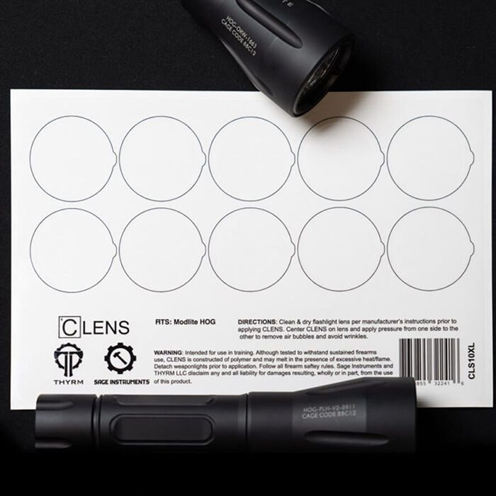 - CLENS (pronunciado “cleanse”) viene en un set de círculos de polímero transparente resistentes al calor, cortados para adaptarse a una amplia gama de lentes de linternas y luces de armas.