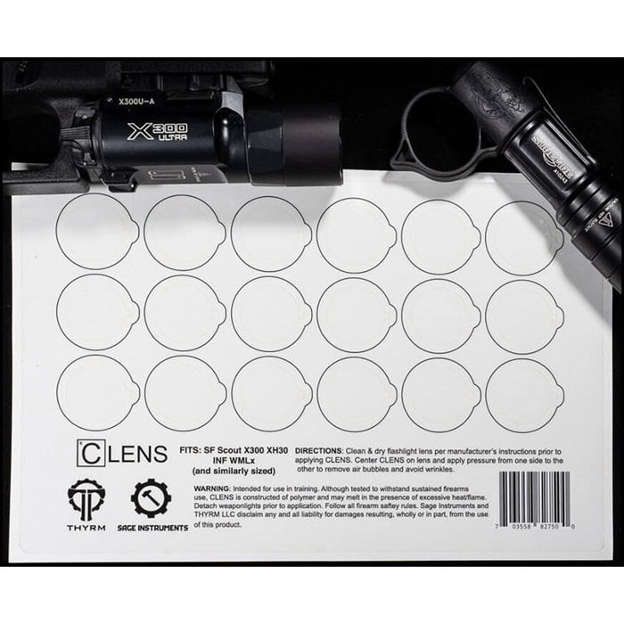 Los CLENS (pronunciado “cleanse”) vienen en un set de círculos de polímero transparente resistentes al calor, cortados para adaptarse a una amplia gama de lentes de linternas y luces de armas. Cada CLENS Protector protege el lente de carbono y otros residuos que pueden acumularse durante el entrenamiento con armas de fuego.