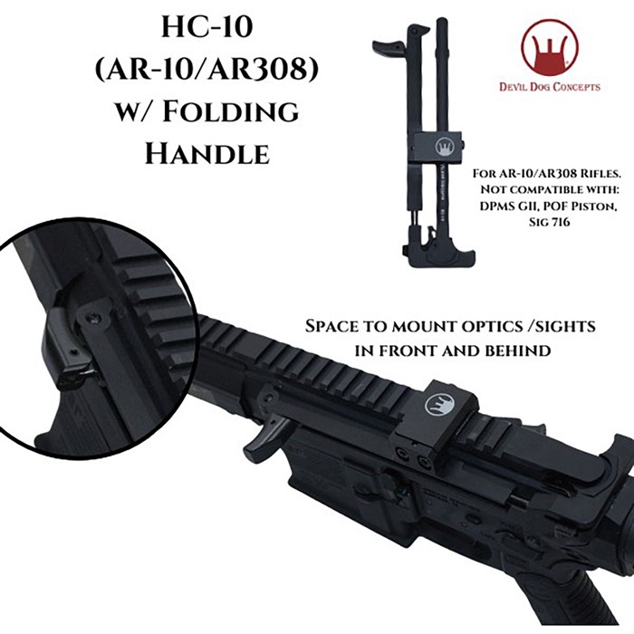 DEVIL DOG CONCEPTS AR-308 HC-10 SIDE CHARGING HANDLE W/FOLDING HANDLE HC-10: The AR-10/AR308 Side Charging Handle – with Folding Handle Sick of the charging handle on your AR-10/AR308 Rifle! Turn your 308 AR style rifle in to a Side Charger? Turn your rifle in to a Side Charger without having to rebuild or modify it. Simply swap out the charging handle and install the Hard Charger. Takes a couple minutes and you are up and running! FEATURES Devil Dog Concepts’ Side Charging Handle System = Ergonomically Beneficial Multiple Ways to Charge Interchangeable from Rifle to Rifle Non Reciprocating Removes Stress on Roll Pin Reduces Torque on Charging Handle Field Strippable – Gross Motor Skills Plenty of Room for Mounting Optics and Sights The HC-10 Side Charging Handle for 308 type AR platforms is designed to adjust to different thicknesses of the varying types of these rifles. The HC-10 is also designed to adjust for different picatinny rail heights and picatinny slot orientations. Does not work on POF Piston Driven rifles or DPMS G2 and similar. SPECS For AR-308 Rifles Not for Sig 716, DPMS GII, or POF Piston Made from 7075 Aluminum Anodized Black, and Steel Weighs 7oz 5 year manufacturer warranty. U.S. Patent No. 9,746,263 U.S. Trademark Reg. No. 5,354,510