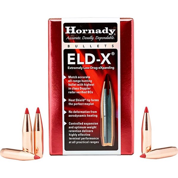 The ELD-X® (Extremely Low Drag - eXpanding) bullet is a technologically advanced, match accurate, ALL-RANGE hunting bullet featuring highest-in-class ballistic coefficients and consistent, controlled expansion at ALL practical hunting distances. FEATURES BEST-IN-CLASS BCS Verified by Doppler radar, the Heat Shield® tip is immune to the effects of aerodynamic heating and retains its shape to maintain the highest-in-class BC over its entire trajectory. MATCH ACCURATE HUNTING BULLET Streamlined secant ogive with optimum boattail design + highly concentric AMP® bullet jackets + Heat Shield® tip combine for radically superior aerodynamic efficiency. ELD-X bullets are available in factory loaded Precision Hunter ammunition. DEVASTATING CONVENTIONAL RANGE PERFORMANCE With high velocity 0-400 yard impact, the bullet continually expands throughout its penetration path. The thick shank of the jacket and high InterLock® ring keep the core and jacket together providing 50-60% weight retention. BEST EXTENDED RANGE TERMINAL PERFORMANCE AVAILABLE Upon low-velocity 400+ yard impacts, the Heat Shield® tip drives backward into the bullet to initiate expansion. Exhibiting conventional expansion with a large mushroom and 85-90% retained weight the bullet provides deep penetration and large wound cavities.