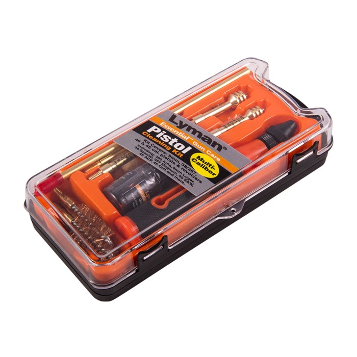 El Kit de Limpieza Multi-Calibre de Lyman limpia una variedad de pistolas, incluyendo calibres como .380 auto, 9mm Luger, .38 Special, .357 Magnum, .40 S&W, .45 ACP y .45 Colt. Todos los componentes están empaquetados en un conveniente estuche de plástico portátil.