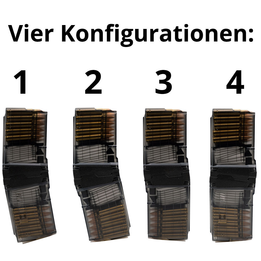 ¡Duplica tu capacidad de carga! Con el CROSS MAG 10/10, acopla fácilmente dos cargadores de 10 disparos, compatibles con .223Rem y más, sin herramientas.