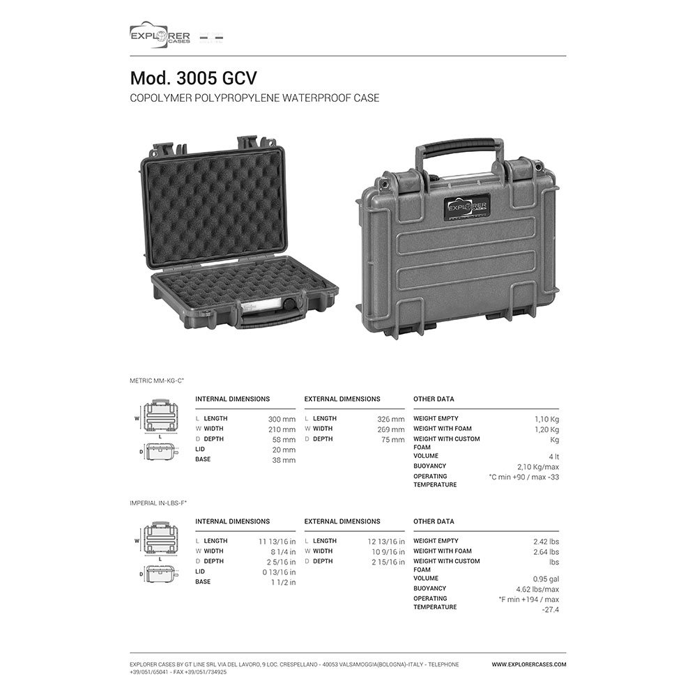 8024482182476 La mejor protección para tu bebé más preciado - La funda de armas definitiva con una variedad de funciones de la más alta calidad, fabricada por Explorer Cases en Italia. Especificaciones: Longitud: 326mm (300mm interior) Anchura: 269mm (210mm interior) Profundidad: 75mm (58mm interior) Peso: 1,20kg (1,10kg peso vacío sin inserción) Color: Negro Inserción: Espuma Convoluta Literalmente indestructible Las fundas de armas de Explorer Cases cuentan con bisagras de metal a prueba de corrosión con características de retención de tapa, que fijan la cubierta y la mantienen en su lugar cuando se abre. Así que puedes estar seguro de que tus fundas de armas te acompañarán durante mucho tiempo. Gracias a los pestillos de bloqueo, las fundas de armas están siempre altamente aseguradas. La junta O-ring también las hace resistentes al agua en gran medida. Cada funda de armas está equipada con una válvula manual de liberación de presión de aire. Por lo tanto, puedes estar tranquilo y no tendrás problemas para manejar y cerrar la funda. Exactamente como lo deseas Las fundas están provistas de recortes internos para soportes internos opcionales o anillas de montaje, para que puedas almacenar todo exactamente como mejor se adapte a tus necesidades. Cada maleta viene con una etiqueta extraíble a prueba de agua con la que puedes etiquetar tu equipo o almacenar tus datos. La funda se puede transportar de manera tradicional a través del gran asa frontal o mediante correas de hombro opcionales, que se pueden adjuntar fácilmente a cualquier modelo. La serie 3005 está optimizada para el transporte en avión.Pedido pendiente, entrega del fabricante retrasada.