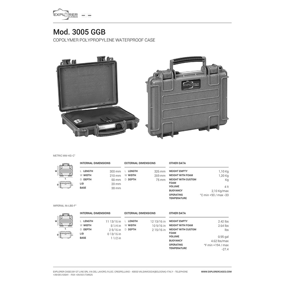 8024482183497 La mejor protección para tu bebé más preciado - La funda para armas definitiva con una variedad de funciones de la más alta calidad, fabricada por Explorer Cases en Italia. Especificaciones: Longitud: 326mm (300mm interior) Ancho: 269mm (210mm interior) Profundidad: 75mm (58mm interior) Peso: 1,20kg (1,10kg peso vacío sin revestimiento) Color: Negro Revestimiento: incl. Gunbag Literalmente indestructible Las fundas para armas de Explorer Cases cuentan con bisagras metálicas a prueba de corrosión con características de soporte de tapa, que fijan la cubierta y la mantienen en su lugar cuando está abierta. Así que puedes estar seguro de que tus fundas para armas te acompañarán durante mucho tiempo. Gracias a los pestillos de bloqueo, las fundas para armas están siempre altamente aseguradas. La junta tórica también las hace resistentes al agua en gran medida. Cada funda para armas está equipada con una válvula de liberación de presión de aire manual. Por lo tanto, puedes estar tranquilo y no tendrás problemas al manejar y cerrar la funda. Exactamente como lo quieres Las fundas están provistas de recortes internos para soportes internos opcionales o anillos de montaje, para que puedas almacenar todo exactamente como más te convenga. Cada maleta viene con una etiqueta removible a prueba de agua con la que puedes etiquetar tu equipo o almacenar tus datos. La funda se puede transportar de manera tradicional a través del gran asa frontal o mediante correas de hombro opcionales, que se pueden adjuntar fácilmente a cualquier modelo. La serie 3005 está optimizada para el transporte en avión.Se recibirá del proveedor después de realizar el pedido. Plazo de entrega de aproximadamente 6-12 semanas