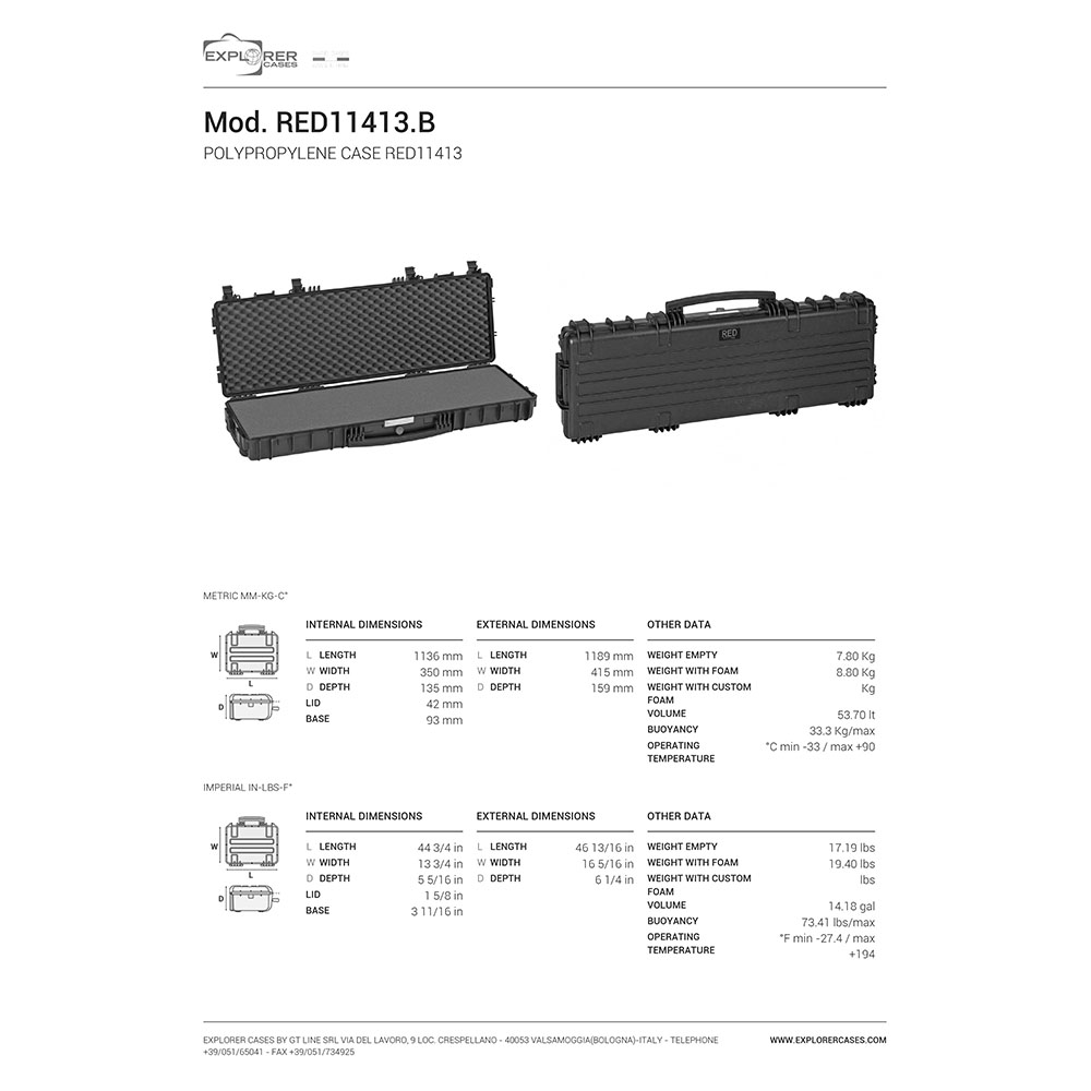 8024482182872 La mejor protección para tu más preciado baby - La maleta de armas definitiva con una variedad de funciones en la más alta calidad, fabricada por Explorer Cases en Italia. Especificaciones: Longitud: 1189mm (1136mm interior) Ancho: 415mm (350mm interior) Profundidad: 159mm (135mm interior) Peso: 8,80kg (7,80kg sin inserto) Color: Negro Inserto: Pre-Cube Foam Literalmente indestructible Las maletas de armas de Explorer Cases cuentan con bisagras de metal a prueba de corrosión con características de soporte de tapa, que fijan la cubierta y la mantienen en su lugar cuando está abierta. Así que puedes estar seguro de que tus maletas de armas te acompañarán durante mucho tiempo. Gracias a los pestillos de bloqueo, las maletas de armas están siempre altamente aseguradas. La junta tórica también las hace resistentes al agua en gran medida. Cada maleta de armas está equipada con una válvula de liberación de presión manual. Por lo tanto, puedes estar tranquilo y no tendrás problemas para manejar y cerrar la maleta. Exactamente como tú lo quieres Las maletas vienen con cortes internos para soportes internos opcionales o anillas de montaje, para que puedas almacenar todo exactamente como te resulte más adecuado. Cada maleta incluye una etiqueta removible a prueba de agua con la que puedes etiquetar tu equipo o almacenar tus datos. La maleta se puede transportar de forma tradicional a través de la gran asa frontal o mediante correas de hombro opcionales, que se pueden adjuntar fácilmente a cualquier modelo. La serie Mod Red 11413 también se puede usar como maleta de trolley.Plazo de entrega de aproximadamente 6-10 días.