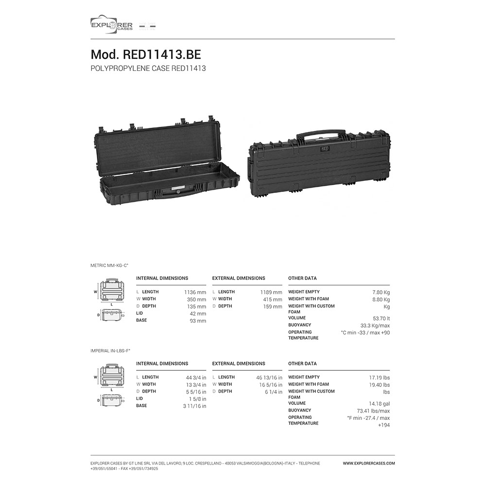8024482182865 La mejor protección para tu bebé más preciado - La funda de armas definitiva con una variedad de funciones de la más alta calidad, fabricada por Explorer Cases en Italia. Especificaciones: Longitud: 1189mm (1136mm interior) Ancho: 415mm (350mm interior) Profundidad: 159mm (135mm interior) Peso: 7,80kg Color: Negro Literalmente indestructible Las fundas de armas de Explorer Cases cuentan con bisagras metálicas a prueba de corrosión con características de soporte de tapa, que fijan la cubierta y la mantienen en su lugar cuando está abierta. Así que puedes estar seguro de que tus fundas de armas te acompañarán durante mucho tiempo. Gracias a los cierres de seguridad, las fundas de armas siempre están altamente aseguradas. La junta tórica también las hace resistentes al agua en gran medida. Cada funda de armas está equipada con una válvula manual de liberación de presión de aire. Por lo tanto, puedes relajarte y no tendrás problemas para manejar y cerrar la funda. Exactamente como lo quieres Las fundas están provistas de cortes internos para soportes internos opcionales o anillas de montaje, para que puedas almacenar todo exactamente como sea más adecuado para tus necesidades. Cada maleta viene con una etiqueta removible a prueba de agua con la que puedes etiquetar tu equipo o almacenar tus datos. La funda puede ser transportada de forma tradicional a través del gran asa frontal o mediante correas de hombro opcionales, que se pueden adjuntar fácilmente a cualquier modelo. La serie Mod Red 11413 también se puede utilizar como maleta trolley.Eliminado del programa