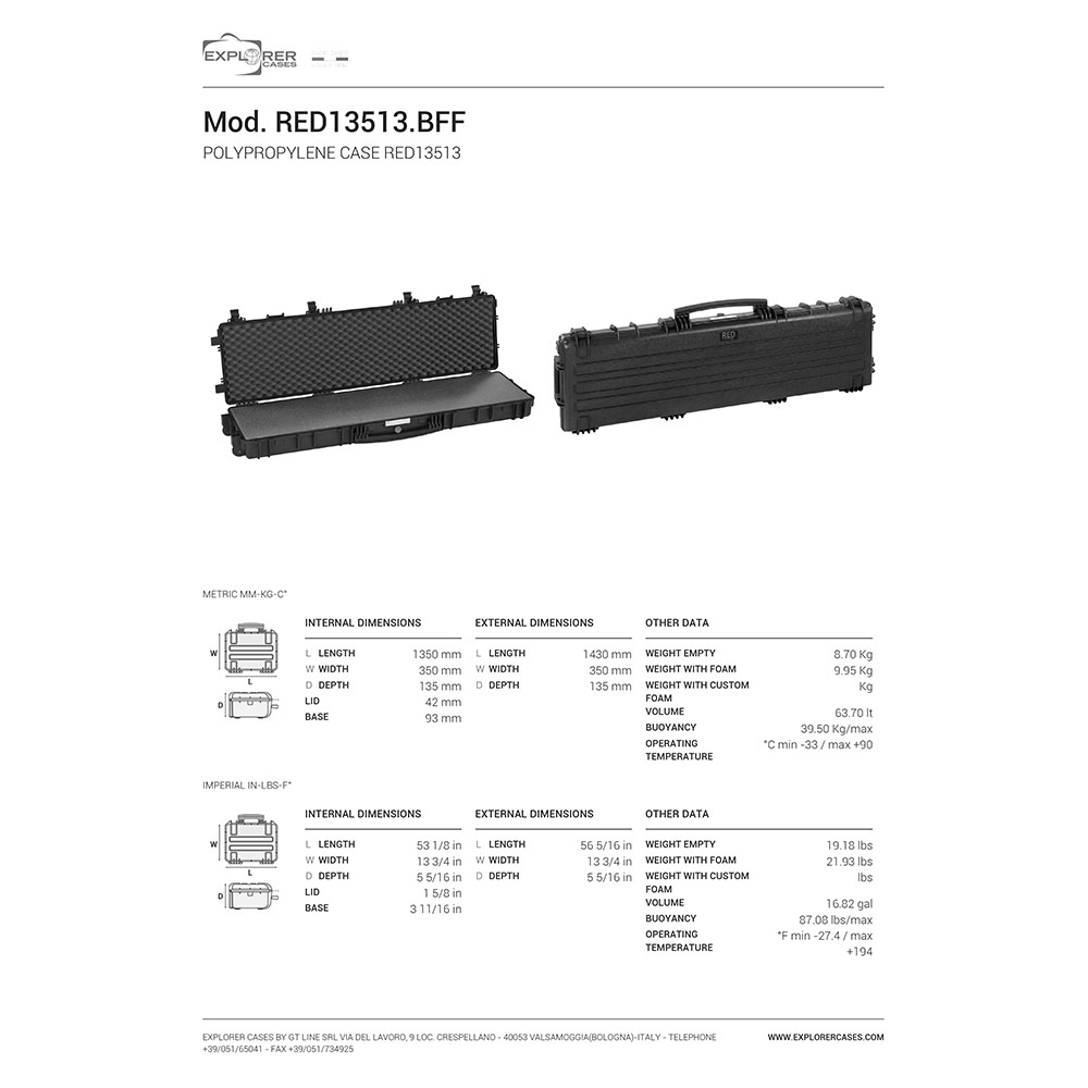 8024482183664 La mejor protección para tu bebé más preciado - La funda de armas definitiva con una variedad de funciones de la más alta calidad, fabricada por Explorer Cases en Italia. Especificaciones: Longitud: 1430mm (1350mm interior) Anchura: 350mm (350mm interior) Profundidad: 135mm (135mm interior) Peso: 9,95kg (8,70kg sin inserción) Color: Negro Inserción: Density Full Foam Literalmente indestructible Las fundas de armas de Explorer Cases cuentan con bisagras metálicas a prueba de corrosión con características de retención de tapa, que fijan la cubierta y la mantienen en su lugar cuando está abierta. Así que puedes estar seguro de que tus fundas de armas te acompañarán durante mucho tiempo. Gracias a los pestillos de bloqueo, las fundas de armas están siempre altamente seguras. La junta de O-ring también las hace resistentes al agua en gran medida. Cada funda de armas está equipada con una válvula manual de liberación de presión de aire. Por lo tanto, puedes relajarte y no tendrás problemas para manejar y cerrar la funda. Exactamente como lo deseas Las fundas están provistas de recortes internos para soportes internos opcionales o anillas de montaje, para que puedas almacenar todo exactamente como sea más adecuado para tus necesidades. Cada maleta viene con una etiqueta removible a prueba de agua con la que puedes etiquetar tu equipo o almacenar tus datos. La funda se puede transportar de forma tradicional a través del gran asa frontal o mediante correas de hombro opcionales, que se pueden adjuntar fácilmente a cualquier modelo. La serie Mod Red 13513 también se puede utilizar como funda de trolley.Se recibirá del proveedor después de realizar el pedido. Plazo de entrega de aproximadamente 6-12 semanas