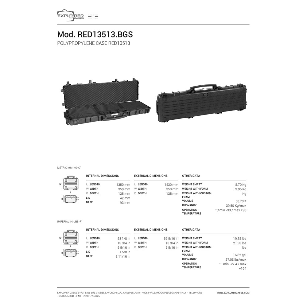 8024482182988 La mejor protección para tu más preciado baby - La funda para armas definitiva con una variedad de funciones de la más alta calidad, fabricada por Explorer Cases en Italia. Especificaciones: Longitud: 1430mm (1350mm interior) Anchura: 350mm (350mm interior) Profundidad: 135mm (135mm interior) Peso: 9,95kg (8,70kg sin inserción) Color: Negro Inserción: incl. Gunbag Literalmente indestructible Las fundas para armas de Explorer Cases cuentan con bisagras de metal a prueba de corrosión con características de retención de tapa, que fijan la cubierta y la mantienen en su lugar cuando está abierta. Así que puedes estar seguro de que tus fundas para armas te acompañarán durante mucho tiempo. Gracias a los pestillos de bloqueo, las fundas para armas están siempre altamente aseguradas. La junta O-ring también las hace resistentes al agua en gran medida. Cada funda para armas está equipada con una válvula manual de liberación de presión de aire. Por lo tanto, puedes estar tranquilo y no tendrás problemas para manejar y cerrar la funda. Exactamente como tú lo quieres Las fundas vienen con recortes internos para soportes internos opcionales o anillos de montaje, para que puedas almacenar todo exactamente como más te convenga. Cada maleta incluye una etiqueta extraíble a prueba de agua con la que puedes etiquetar tu equipo o almacenar tus datos. La funda se puede transportar de manera tradicional a través del gran asa frontal o mediante correas de hombro opcionales, que se pueden adjuntar fácilmente a cualquier modelo. La serie Mod Red 13513 también se puede utilizar como maleta con ruedas.Plazo de entrega de aproximadamente 6-10 días.