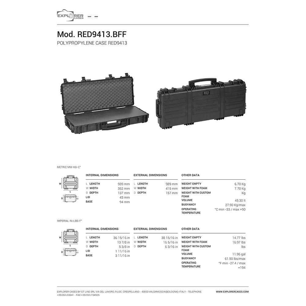 8024482183671 La mejor protección para tu bebé más preciado - La funda definitiva para armas con una variedad de funciones en la más alta calidad, fabricada por Explorer Cases en Italia. Especificaciones: Longitud: 989mm (939mm interior) Anchura: 415mm (352mm interior) Profundidad: 157mm (137mm interior) Peso: 7,70kg (6,70kg sin revestimiento) Color : Negro Revestimiento: Density Full Foam Literalmente indestructible Las fundas para armas de Explorer Cases cuentan con bisagras metálicas a prueba de corrosión con características de retención de tapa, que fijan la cubierta y la mantienen en su lugar cuando está abierta. Así que puedes estar seguro de que tus fundas para armas te acompañarán durante mucho tiempo. Gracias a los cierres de seguridad, las fundas para armas están siempre altamente aseguradas. La junta de O-ring también las hace resistentes al agua en gran medida. Cada funda para armas está equipada con una válvula manual de liberación de presión de aire. Por lo tanto, puedes estar tranquilo y no tendrás problemas para manejar y cerrar la funda. Exactamente como tú lo quieres Las fundas vienen con recortes internos para soportes internos opcionales o anillos de montaje, así que puedes almacenar todo exactamente como más te convenga. Cada maleta viene con una etiqueta impermeable extraíble con la que puedes etiquetar tu equipo o almacenar tus datos. La funda se puede transportar de forma tradicional a través del gran asa frontal o mediante correas de hombro opcionales, que se pueden adjuntar fácilmente a cualquier modelo. La serie Mod Red 9413 también se puede usar como maleta con ruedas.Plazo de entrega de aproximadamente 6-10 días.