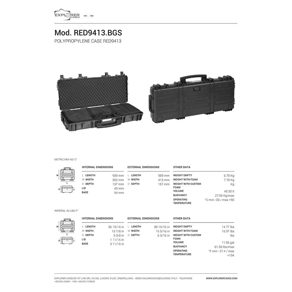 8024482182964 La mejor protección para tu bebé más preciado - El estuche para armas definitivo con una variedad de funciones en la más alta calidad, fabricado por Explorer Cases en Italia. Especificaciones: Longitud: 989mm (939mm interior) Anchura: 415mm (352mm interior) Profundidad: 157mm (137mm interior) Peso: 7,70kg (6,70kg sin inserto) Color: Negro Inserto: incl. Gunbag Literalmente indestructible Los estuches para armas de Explorer Cases cuentan con bisagras de metal a prueba de corrosión con características de soporte de tapa, que fijan la cubierta y la mantienen en su lugar cuando está abierta. Así que puedes estar seguro de que tus estuches para armas te acompañarán durante mucho tiempo. Gracias a los pestillos de bloqueo, los estuches para armas están siempre altamente asegurados. La junta tórica también los hace resistentes al agua en gran medida. Cada estuche para armas está equipado con una válvula manual de liberación de presión de aire. Por lo tanto, puedes estar tranquilo y no tendrás problemas para manejar y cerrar el estuche. Exactamente como lo quieres Los estuches están provistos de recortes internos para soportes internos opcionales o anillos de montaje, para que puedas almacenar todo exactamente como sea más adecuado para tus necesidades. Cada maleta viene con una etiqueta extraíble a prueba de agua con la que puedes etiquetar tu equipo o almacenar tus datos. El estuche se puede transportar tradicionalmente a través del gran asa frontal o mediante correas de hombro opcionales, que se pueden adjuntar fácilmente a cualquier modelo. La serie Mod Red 9413 también se puede usar como estuche de trolley.Plazo de entrega de aproximadamente 6-10 días.
