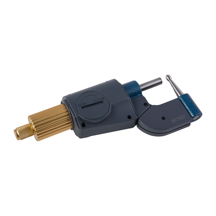 Este micrómetro incluye muchas características esenciales y adicionales para el uso de mediciones tradicionales. Una adición particular a esta unidad es la inclusión de un yunque en forma de huevo, diseñado especialmente para ayudar en la medición del grosor del cuello de latón.
