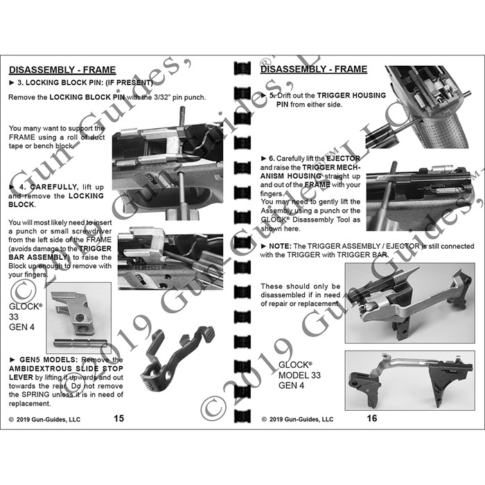 FEATURES: The only current printed manual that includes information on ALL models. GEN 1 2 3 4 5 Model 17 19 20 21 22 23 24 26 27 29 30 31 32 33 34 35 37 38 39 40 41 42 43 45 48 X and MOS versions. Easy to use -- Comb binding lies open and flat on your work surface. 28 pages & 63 high-resolution grayscale images. Cardstock cover. Bright white paper. ALL images and text are © 2019 Gun-Guides, LLC. - ALL Rights Reserved. All references to GLOCK® and Safe Action Pistols® are federally registered trademarks of GLOCK® , Inc. or Glock Ges.m.b.H. Gun Guides® and this publication are not affiliated with or endorsed by GLOCK® , Inc. or Glock Ges.m.b.H